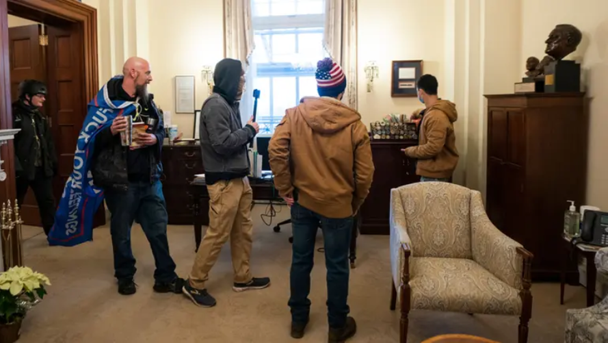 Nancy Pelosi wird uns in dieser Abhandlung noch einmal begegnen. Diese „Wiederbegegnung“ kann uns möglicherweise helfen zu verstehen, warum es eine gewisse Ironie in sich trägt, dass die „Trumpisten“ ausgerechnet in deren Büro „stöberten“. Eher sieht das nach einem ziemlich schlecht gespielten Akt innerhalb einer Theatervorführung aus. Die Akteure sind auch nicht fokussiert, sie bewegen sich im Gebäude wie Touristen, die einem geführten Museumsbesuch beiwohnen (8).