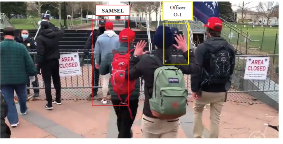 „Andere Videos vom 6. Januar selbst zeigten Herrn Epps, wie er sich zu einem Mitstreiter an einer Barrikade vor dem Kapitol beugte und ihm offenbar etwas ins Ohr flüsterte. Dieser Mann — ein Friseur aus Pennsylvania namens Ryan Samsel — konfrontierte innerhalb weniger Minuten Polizeibeamte, was zum ersten Durchbruch der Polizeiketten am Gebäude führte.“ (32i)