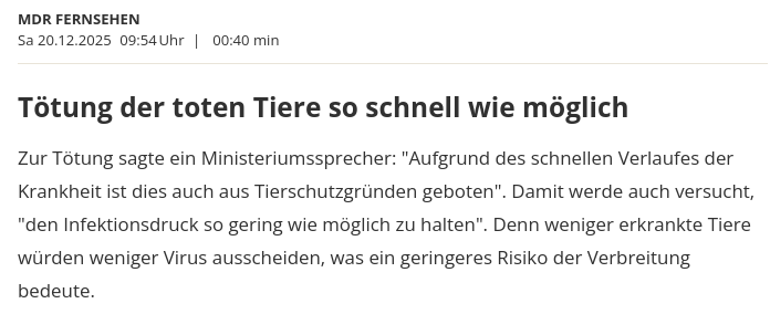 „Zur Tötung sagte ein Ministeriumssprecher: »Aufgrund des schnellen Verlaufes der Krankheit ist dies auch aus Tierschutzgründen geboten«. Damit werde auch versucht, »den Infektionsdruck so gering wie möglich zu halten«. Denn weniger erkrankte Tiere würden weniger Virus ausscheiden, was ein geringeres Risiko der Verbreitung bedeute.“ (1ii)